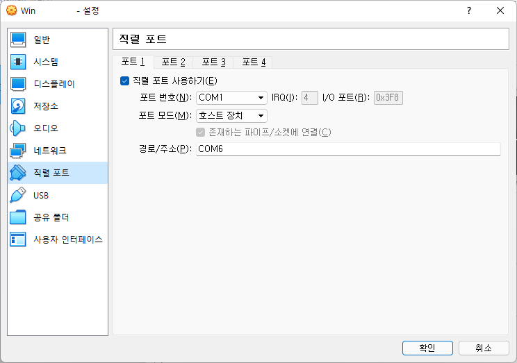 VirtualBox 에서 시리얼 포트(Serial port) 설정