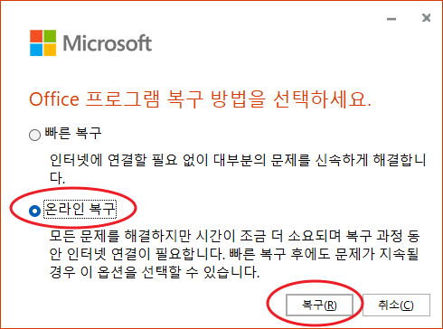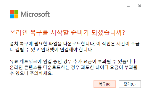 온라인 복구 선택 하고 복구를 시도 합니다.