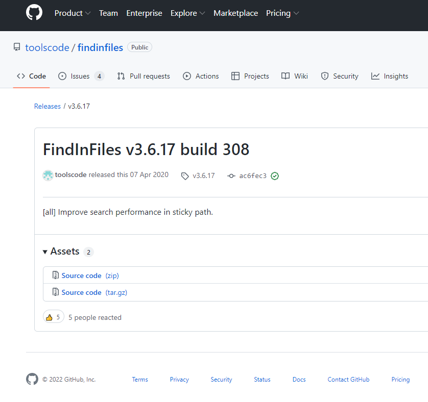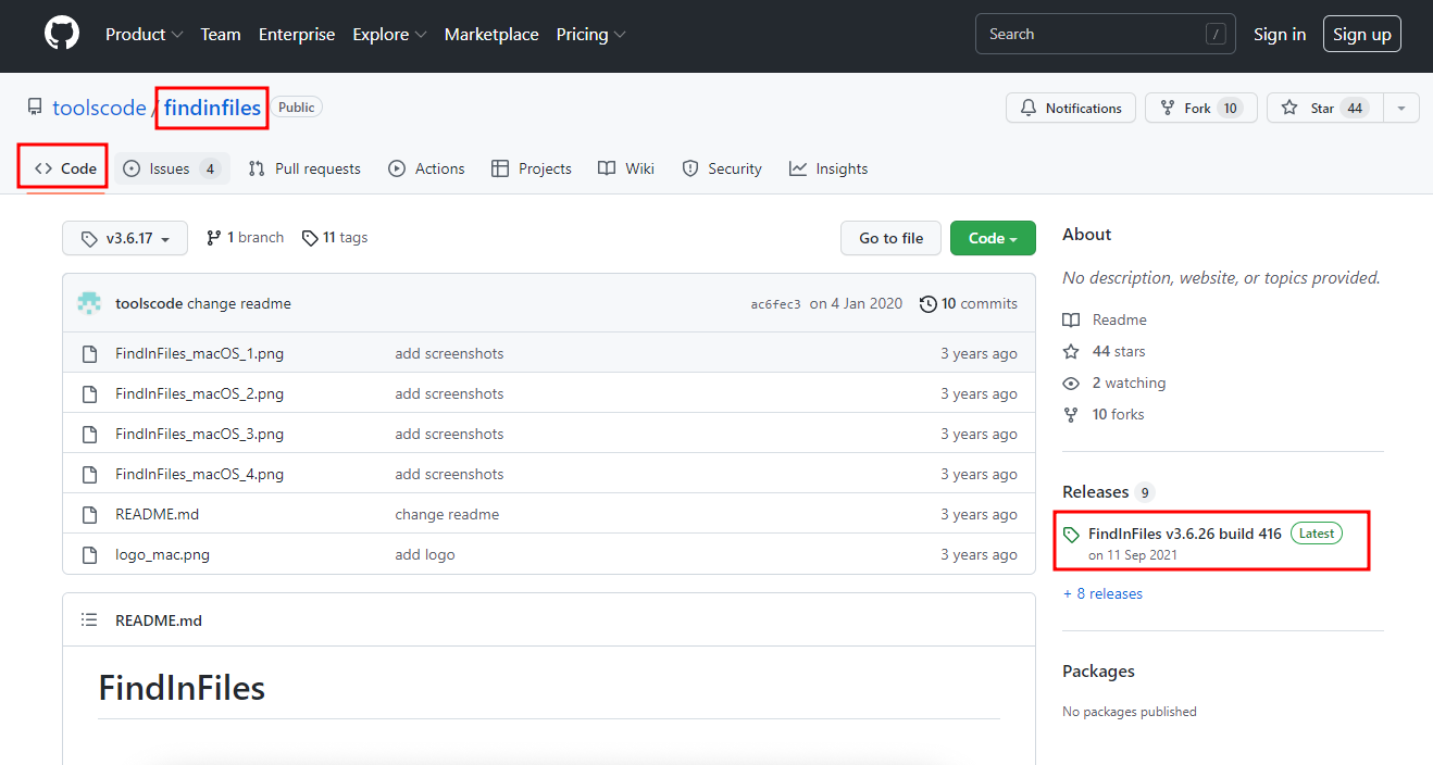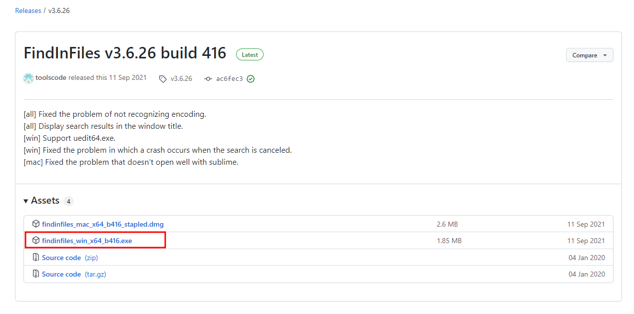 홈페이지 우측 상단에 Code 또는 findinfiles 를 클릭하면 우측 하단에 Releases 가 표시되며,